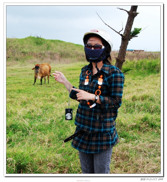 在往北環的路上,一開始還不習慣澎湖的我們,見到路上有牛,實在非常興奮,而對著牛叫的我,似乎牛不領情,好不容易,牛老大心情稍微比較開一點,才肯對著鏡頭使個眼色,使得原本已經放棄戴著安全帽要離開的我,連帽子都來不及脫,就趕快去跟牛老大拍個合照!