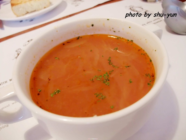 餐前湯, 洋蔥番茄湯, 其實我倒是比較期待濃湯類的, 雖然這湯喝起來也是很好喝, 就是滿一般大眾口味...