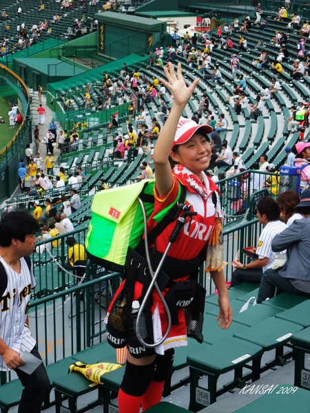 球場上滿多賣生啤酒的工讀生, 日本人喝生啤酒的功力真的很了不起...