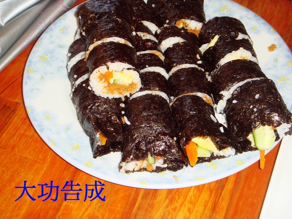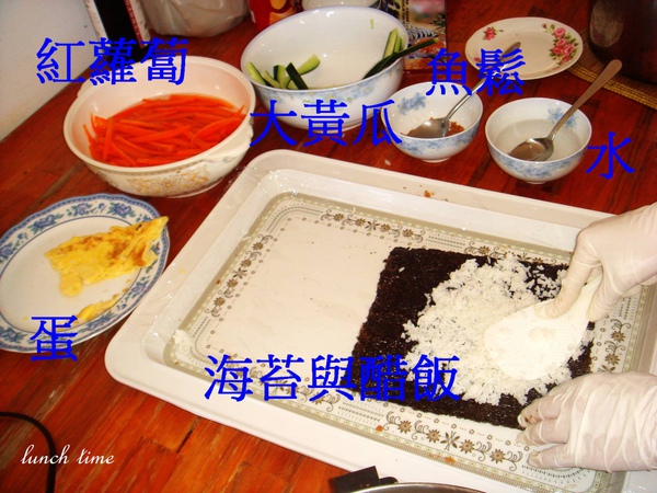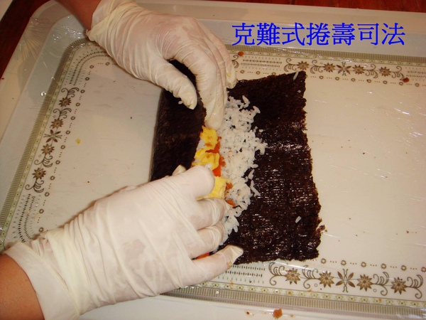 希望廚房阿姨有看到我捲壽司的樣子, 記得要戴手套, 這樣比較衛生與安全...