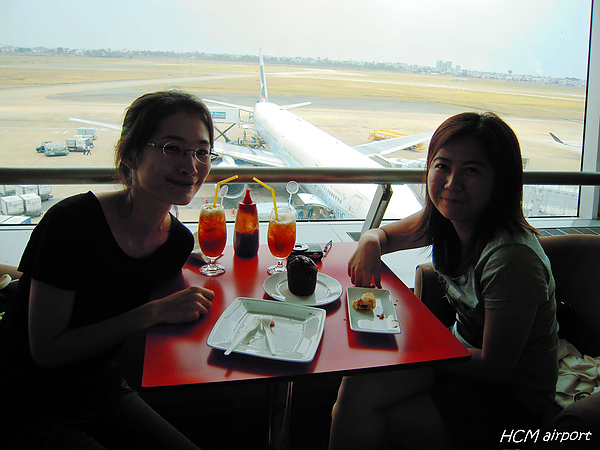 大部分去吳哥窟均由HCM轉機到暹粒(siem reap), 逛完免稅店後, 我與安欣到四樓有wifi的cafe吃東西, 上上網, 結果有個瑞士伯伯突然跟我們聊起天來, 又說要幫我們拍合照, 雖然他的拍照技術很NG, 但還是滿謝謝他的好意的...