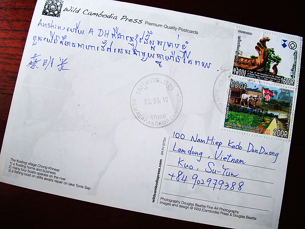 寄給自己的內容除了地址自己寫以外, 請了陪伴我們四天的tuk tuk driver, korng, 寫上柬埔寨文字給我們, 雖然看不懂他的意思, 但korng說, 是祝福健康順心之意, (我想大概也是這些可以寫吧!!!)